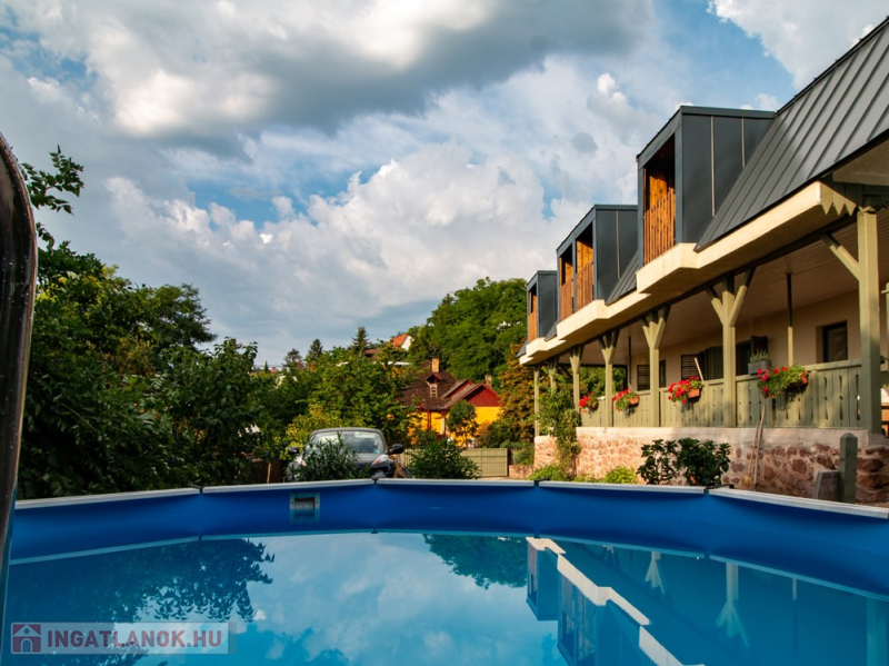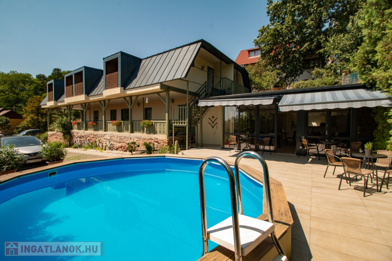 Kiváló befektetés! Év végéig most 55 millió Ft-tal olcsóbban megveheti. Balatonalmádi központjának, csendes mellékutcájában 2 éve teljesen felújított 9 db. kisebb apartmanból, 2 db. lakosztályból, 1 db. konyha-étteremből álló villa épület panorámás teraszokkal, erkélyekkel, kültéri medencével, pincével, 9-10 gépkocsi részére alkalmas felszíni beállóval eladó.