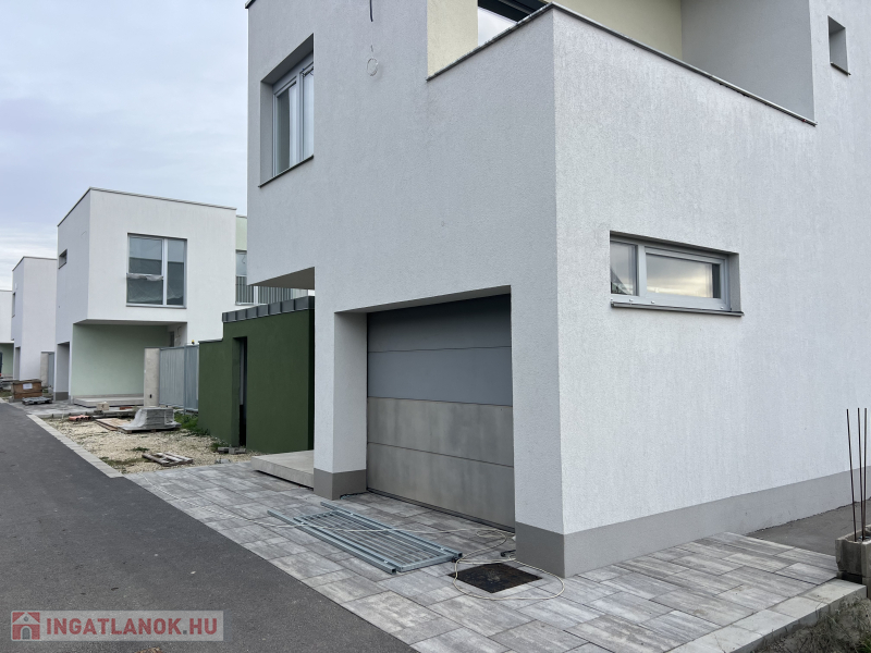 Épület körül nagy méretű trendi térburkolattal, növény sáv elválasztó szegélyekkel, szigetelt kerti tároló. Lapos tetőre jutás 3 rétegű üvegezésű Velux kupolán keresztül történik, belső vízelvezetéssel, szikkasztókkal.Jelenleg többféle típusú ház van eladó, az árak a ház méretétől ,szobaszámától,felszereltségétől változik 189mft- 239mft között !