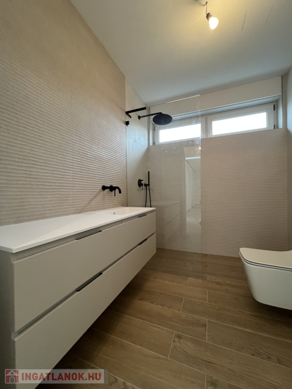 Beépített design csaptelepek, egyedi fürdőszoba szekrényekkel, design szaniterek, Geberit folyókákkal, síkba záródó egyedi belső ajtókkal, kulcslyuk nélküli, design kilincsekkel. Kiépített Okos Otthon, nagy értőképernyős riasztóval, arcfelismerős kaputelefonnal, hűtő-fűtő klímák, elektromos kapuk, elektromos garázsajtók.